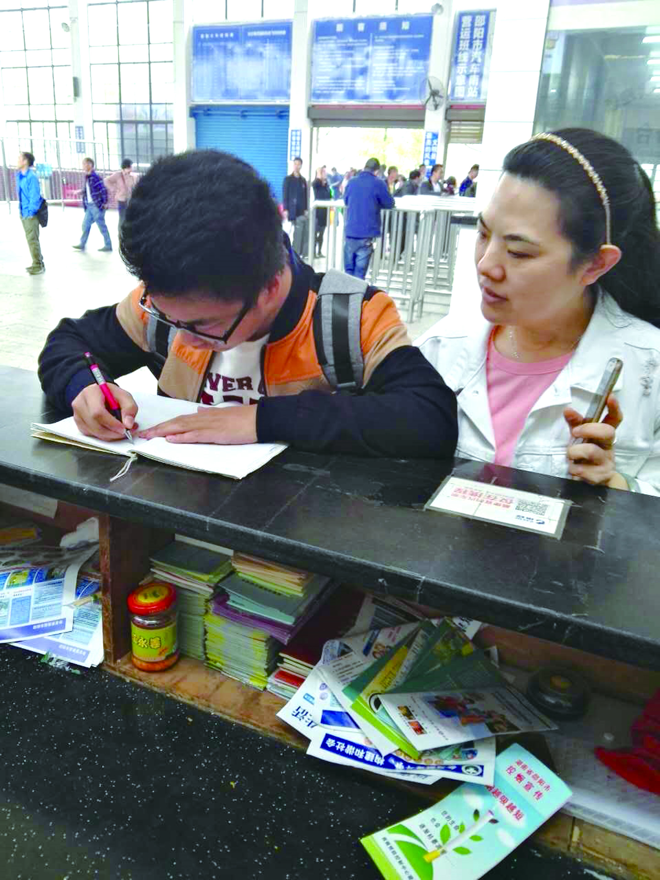 (徐容芳報道)    4月6日上午,市汽車南站的客流高峰還在持續(xù),售票廳買票上車的旅客絡繹不絕,正在安檢機前值班的員工周擁軍有條不紊的指揮著購票進站的旅客把大包小包的行李過機安檢。11時許,旅客漸漸稀少,周擁軍拿起桌上的杯子想喝口水,這時他卻無意中發(fā)現(xiàn)安檢機傳送帶旁有一個背包在地上。于是,周擁軍撿起趕緊喊剛過去的幾個旅客,但都說不是他們的,周擁軍趕緊將包拿到該站總服務臺,廣播員連續(xù)廣播失物認領七八次仍沒人領取。12時左右,一學生模樣的大男孩匆匆來到服務臺認領自己的背包,在確認旅客身份后,值班副站長張紅文把包交還給了此男孩,其非常感激連說謝謝,并從包里拿出紙和筆來,伏在服務總臺匆匆寫了一封感謝信,才登上了發(fā)往長沙西站的班車。
